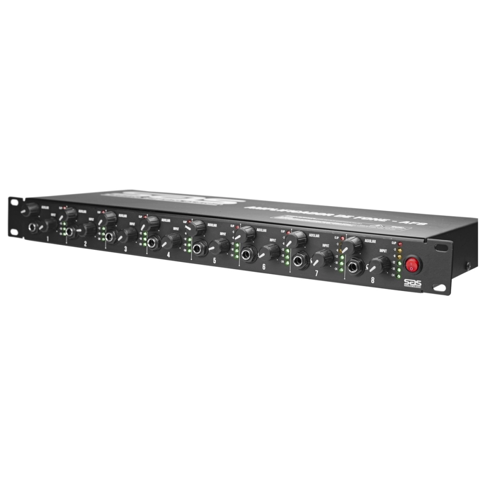 O AF8 é um sistema de monitoramento monofônico de áudio profissional para até 16 fones, sendo 8 na parte frontal e 8 na parte traseira. Este equipamento permite a distribuição de um sinal de áudio geral para os 8 canais, fora uma entrada individual por canal, assim você consegue mixar o sinal geral e o sinal individual com controle de volume independente. Com excelente qualidade sonora e baixo ruído, o AF8 se torna mais prático a monitoração em palcos de pequeno, médio e grande porte. Além disso, pode ser utilizado como: retorno para ensaios, lives e também na gravação de podcasts.