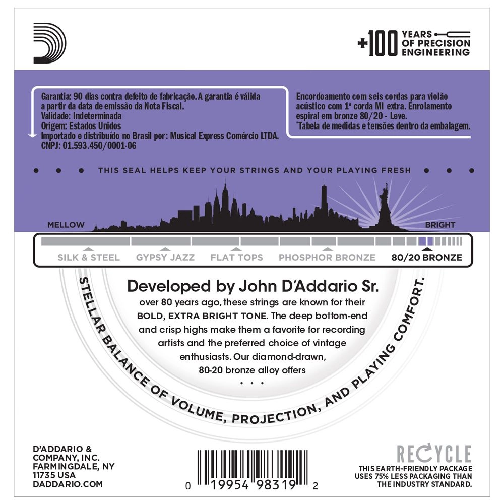 Encordoamento Para Violão Aço Daddario 011 Bronze 80/20 EJ13-B C/ Mi Extra