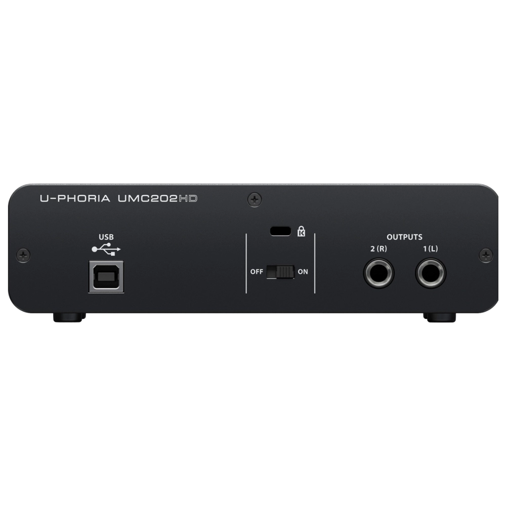 A UMC202HD possui entradas combinadas XLR/TRS, saídas balanceadas ¼” TRS e porta USB para alimentação e comunicação com o computador. Seu chassi em metal resistente garante durabilidade e confiabilidade mesmo em uso intenso.